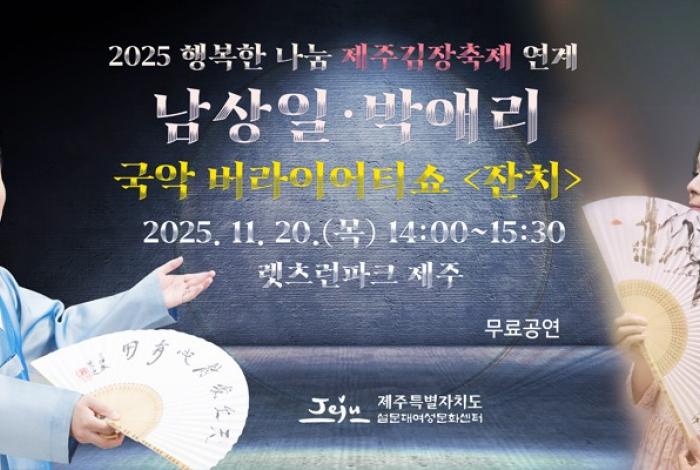 제주도 설문대여성문화센터가 오는 20일 오후 2시부터 3시 30분까지 렛츠런파크 제주에서 ‘2025 행복한 나눔 제주김장축제’와 연계한 국악 버라이어티쇼 ‘잔치’를 개최한다.이번 축제는 기관·단체별로 운영되던 김장 및 기부활동을 ‘연합형 사회공헌’&a...