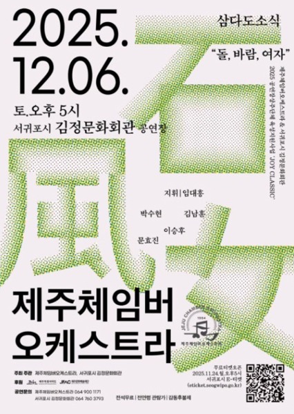 공연은 △작곡가 박수현의 ‘제주의 돌·바람·여자’를 비롯해 △이승후의 제주도의 사계 중 '겨울' △김남훈의 ‘삼다도 소식’과 ‘제주도의 푸른 밤’ △문효진의 ‘오돌또기+느영나영’ 등 제주 정서를 담은 다채로운 작품들이 제주체임버오케스트라의 연주로 선보이며 제주 고유의 문화와 감성을 음악으로 재해석하는 특별한 무대를 선사할 예정이다.