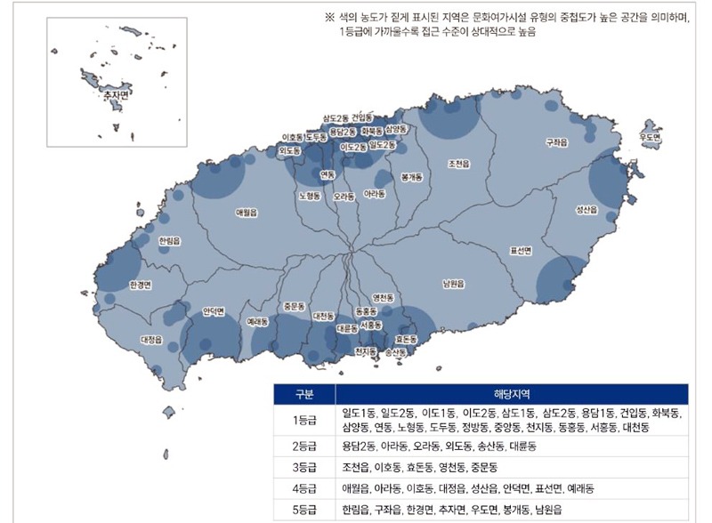 반면 읍·면 지역은 접근성 개선이 필요한 것으로 나타났다. 한림읍, 구좌읍, 한경면, 추자면, 우도면 등은 상대적으로 접근성이 낮았다. 읍·면 지역은 단일 유형의 서비스 의존도가 높고 시설 간 상호보완성이 낮은 구조로 분석됐다.