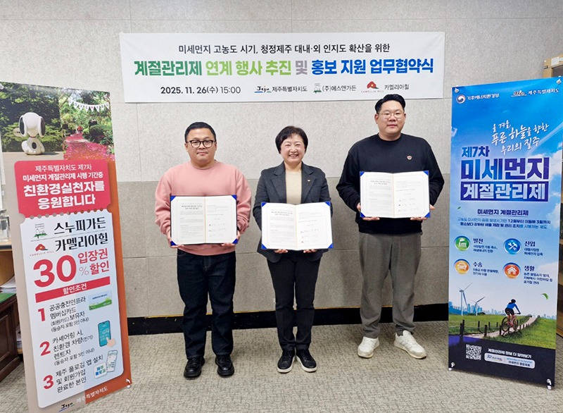 제주도는 지난 26일 두 관광지와 업무협약을 맺었다. 계절관리제 인지도를 높이고 친환경 활동을 확산하고자 이번 시범사업을 기획했는데 청정 제주를 지키려는 친환경 실천자에게 실질적 혜택을 제공해 자발적 참여를 이끌어 내겠다는 취지이다.