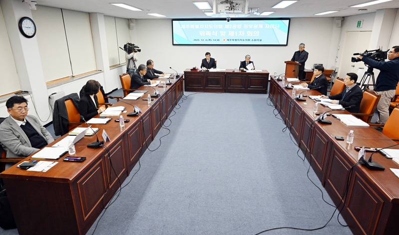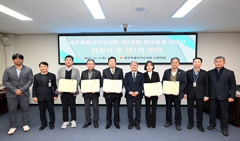 제주특별자치도의회(의장 이상봉)가 4일 오후, 도의회 의사당 소회의실에서 ‘제주 제2공항 건설사업 정보공개 자문단’ 위촉식을 개최하고 제1차 회의까지 진행했다.