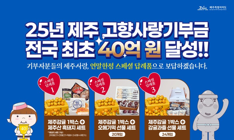 제주특별자치도가 올해 고향사랑기부금이 지난 4일 기준 전국 최초로 단년도 40억 원(40억 700만 원, 3만 9천454건)을 넘어섰다.