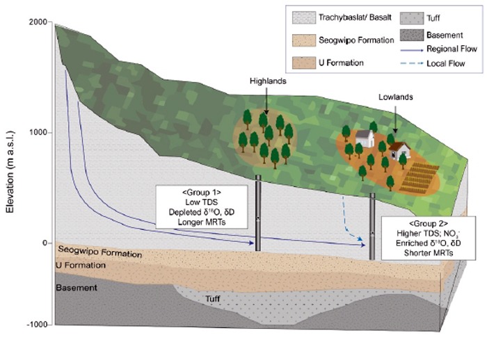 제주개발공사는 고려대학교 윤성택 지구환경과학과 교수 연구팀과 함께 2016~2020년, 2022~2023년 총 7년에 걸쳐 수집한 강수·지하수의 안정동위원소(δ¹⁸O, δD), 환경추적자(CFCs, 삼중수소) 및 수화학 자료를 통합 분석해 지하수의 함양고도, 이동 경로, 체류시간을 산정했다.