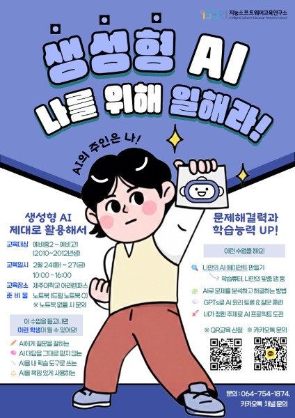 제주대학교 지능소프트웨어교육연구소(iSERI, 소장 조정원)가 오는 24일부터 27일까지 4일간 제주대학교 아라캠퍼스에서 제주지역 예비 중학교 2학년부터 예비 고1 학생을 대상으로 생각에 날개를 다는 교육프로그램 ‘생성형 AI, 나를 위해 일해라!’를 운영한다.