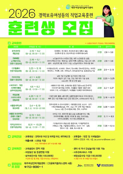 서귀포여성새일센터는 △AI활용 마케팅영상제작&온라인창업 △노인장기요양기관 실무자 양성 △회계실무자 양성 △디지털 사무능력 향상 등 4개 과정에 80명을 모집한다.