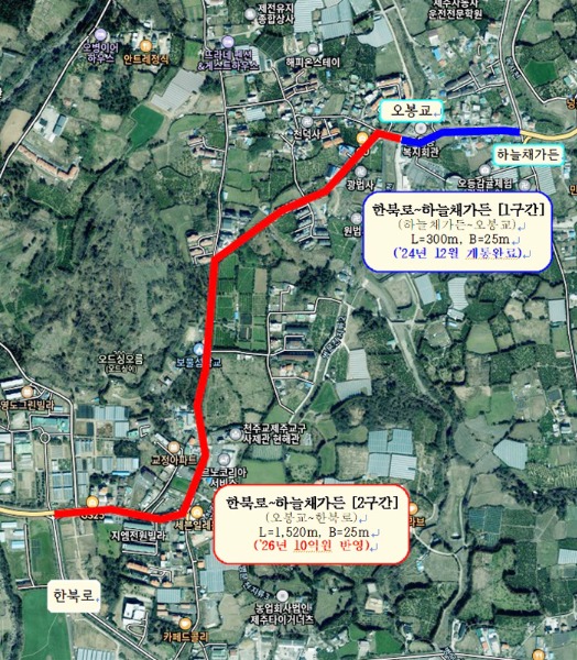 한북로-하늘채가든 도로확장사업은 지난 1976년 3월 최초 도시계획시설로 결정된 이후 장기간 미 집행돼 왔으며, 2021년 장기계속공사로 최초 발주됐다. 이후 2024년 12월 1구간(연장 300m, 폭 25m) 공사를 완료했다.