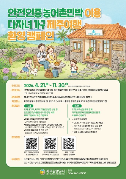 제주관광공사, 다자녀 가구 대상 안전 인증 농어촌민박 이용 촉진 캠페인 추진