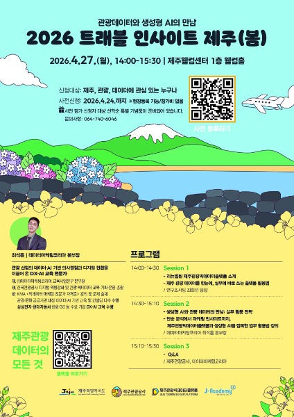 제주관광공사가 오는 27일 제주웰컴센터에서 관광사업체, 공공기관, 학계 등 관광과 데이터에 관심 있는 분들을 대상으로 데이터 기반 의사결정을 지원하기 위한 ‘2026 트래블 인사이트 제주(봄)’ 세미나를 개최한다.