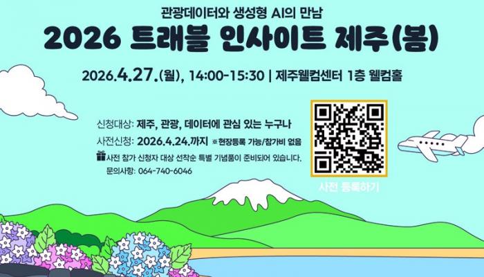 제주관광공사가 오는 27일 제주웰컴센터에서 관광사업체, 공공기관, 학계 등 관광과 데이터에 관심 있는 분들을 대상으로 데이터 기반 의사결정을 지원하기 위한 ‘2026 트래블 인사이트 제주(봄)’ 세미나를 개최한다. 이번 세미나에선 새롭게 개편한 제주관광 빅데이터 플랫폼(data.ijto.or.kr)의 활용 방안을 소개하고, 생성형 인공지능(AI)과 관광데이터를 결합한 실무 활용 전략을 공유한다.▲ ‘2026 트래블 인사이트 제주(봄)’ 세미나 리플릿관광 산업 전반에서 데이터 기반의 의사결정과 디지털 전환이 가속화되는 가운데...