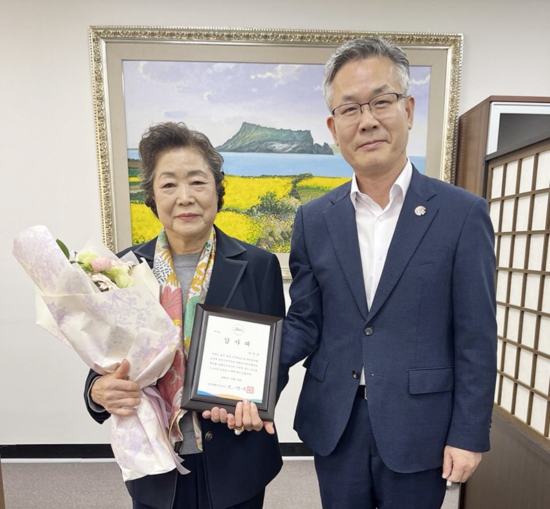 제주도는 24일 오후, 도청 행정부지사실에서 이신숙 씨에게 감사패를 전달했다.