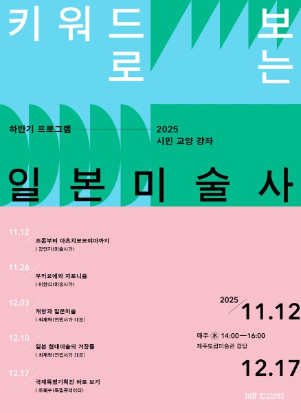 제주도립미술관은 오는 11월 12일부터 12월 17일까지 수요일 오후 2~4시 미술관 강당에서 ‘2025 시민 교양 강좌’ 하반기 프로그램 ‘키워드로 보는 일본미술사’를 운영한다.