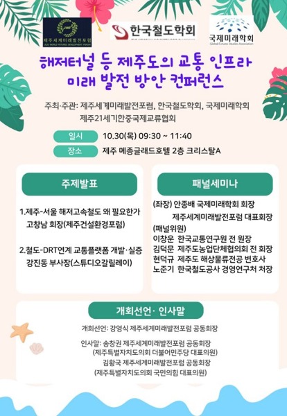 이어지는 패널세미나는 안종배 국제미래학회 회장(제주세계미래발전포럼 대표회장)이 좌장을 맡아 진행하는데 ▲이창운 전 한국교통연구원 원장 ▲김덕문 전 제주도농업단체협의회 회장 ▲현덕규 제주 해상물류 전문 변호사 ▲노준기 한국철도공사 경영연구처장이 참여해 미래 교통 인프라 변화, 기후위기 대응 교통, 교통·관광·물류·법률·기술 등 다방면의 시각에서 제주도 교통 인프라의 미래 청사진을 제시한다.
