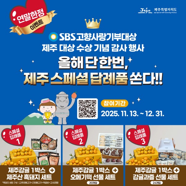 제주도가 ‘제1회 SBS 고향사랑기부대상’ 광역시·도 부문 대상 수상을 기념해 오는 13일부터 연말까지 ‘올해 단 한 번, 제주 스페셜 감사 답례품’을 한시적으로 출시한다.