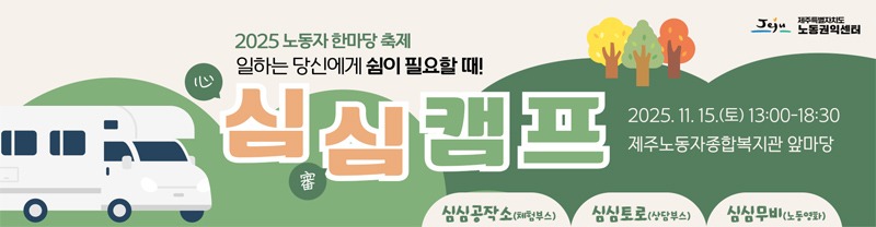 제주특별자치도 노동권익센터(센터장 김경보)가 오는 15일 오후 1시, 제주도 노동자종합복지관 일원에서 ‘2025 노동자 한마당축제 심(心)심(審)캠프’를 개최한다.