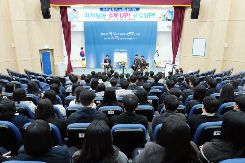제주도는 24일 오전 공공정책연수원 대강당에서 제주도·의회·제주시·서귀포시의 제3기 신규임용자과정 교육생 100명을 대상으로 ‘지사와 함께하는 소통 프로그램’을 운영했다.