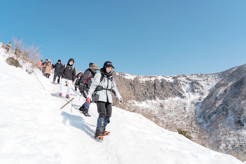 제주에 눈이 내리면 새로운 재미가 열린다. 눈 덮인 한라산, 오름을 직접 걷는 재미가 쏠쏠하다. 한 걸음 걸을 때마다 뽀득뽀득 느껴지는 눈의 촉감과 새하얗게 펼쳐진 설원이 겨울 제주를 더욱 신나게 만든다. 고요한 자연을 오롯이 느끼며 걸을 수 있다는 점이 겨울 산행의 매력이 아닐까. 백록담 정상 등반 시 반드시 에는 예약이 필요하며 안전 수칙을 꼭 지켜 산행을 즐기길 바란다.