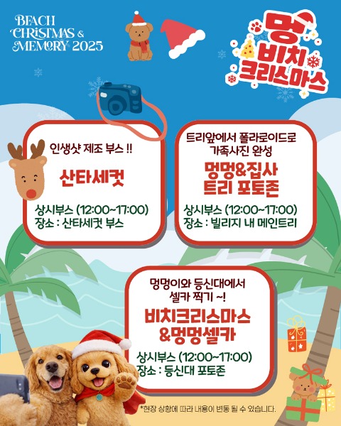 체험 프로그램은 △멍멍 비치레이스 △멍멍 트레저헌트(보물찾기) △산타 세컷 △멍멍&집사 트리 포토존 △비치크리스마스&멍멍셀카 등이 진행된다.