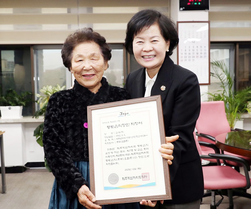 제주도는 이날 김애숙 정무부지사가 김태자 장인에게 직접 지정패를 수여했는데 이후 향토음식 교육, 품평회 참가, 관광 콘텐츠 제작 등을 지원할 계획이다.