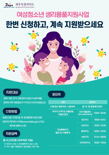 제주도가 성평등가족부와 함께 취약계층 여성청소년의 건강권 보장을 위해 생리용품 구매지원금(바우처)을 지원하고 있다.