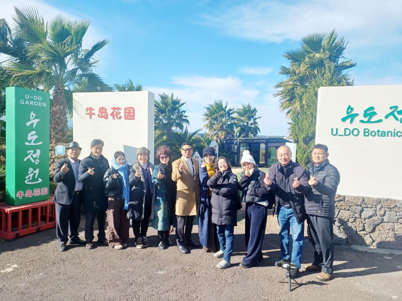 제주 성산항에서 출발해 우도 하우목동항에 내린 일행들은 가까운 우도랑 카페에서 땅콩아이스크림과 커피를 마시면서 하루 스케줄을 안내받았고, 관광을 시작했다. 나지막한 집과 소박한 돌담에 마음을 빼앗기고 일행들은 ‘우도정원’에서 겨울동백꽃의 향연을 즐기고 특색 있는 각종 꽃들과 나무들을 감상하고 특히 야자 터널을 지나면서 소중한 담소를 나눴다.