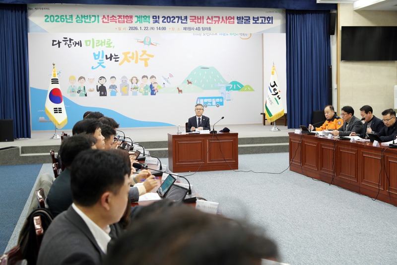 이러한 계획을 논의하기 위해 제주도는 지난 22일 오후, 도청 탐라홀에서 진명기 행정부지사 주재로 ‘2026년 상반기 신속집행 추진 계획 및 2027년 국비 신규사업 발굴 보고회'를 개최했다.