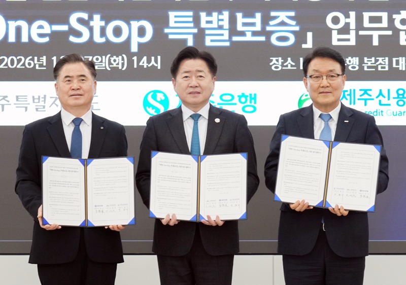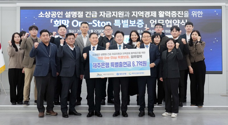 제주도는 27일 제주은행 본점에서 제주은행, 제주신용보증재단과 함께 소상공인 설명절 긴급 자금지원과 지역경제 활력 증진을 위한 ‘희망 원스톱(One-Stop) 특별보증’ 업무협약을 체결했다.