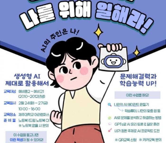 제주대학교 지능소프트웨어교육연구소(iSERI, 소장 조정원)가 오는 24일부터 27일까지 4일간 제주대학교 아라캠퍼스에서 제주지역 예비 중학교 2학년부터 예비 고1 학생을 대상으로 생각에 날개를 다는 교육프로그램 ‘생성형 AI, 나를 위해 일해라!’를 운영한다.