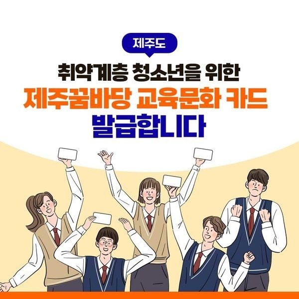 제주도가 도내 취약계층 청소년의 교육 격차 해소를 위한 ‘제주꿈바당 교육문화카드’ 신청을 오는 24일부터 주소지 읍면동 주민센터에서 접수한다.