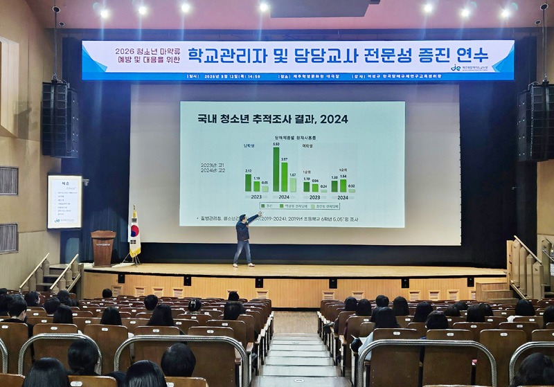 제주도교육청이 지난 12일 제주학생문화원 대강당에서 도내 학교 관리자와 업무 담당 교사 400여 명을 대상으로 ‘2026 청소년 마약류 예방 및 대응 전문성 증진 연수’를 개최했다.