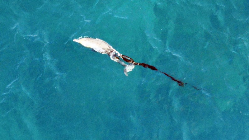 거의 잘려나간 등지느러미에 붙어 있는 폐어구(자망으로 추정됨)에 해조류가 달라붙으며 저항이 심해지고 있고, 이 때문에 이 돌고래가 유영하는 반대방향에서 해조류가 붙은 폐어구가 잡아당기고 있는 형편이다.