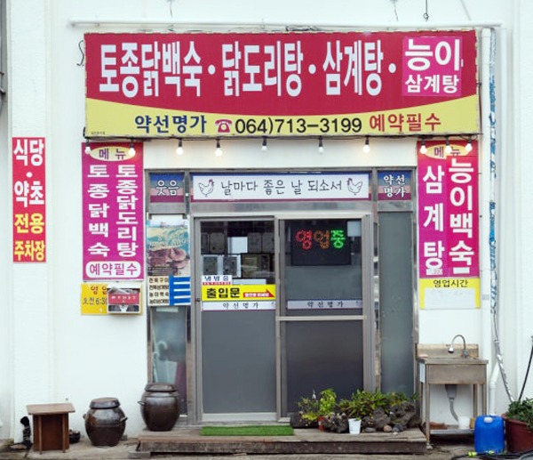 제주시 서쪽 애월 초입의 하귀에 위치한 김 명인의 약선명가(藥線名家)를 찾았다. 예약이 필수인 이 집의 음식들은 닭을 주재료로 하는 삼계탕인데 부재료는 능이, 전복, 표고, 약선 등이다.